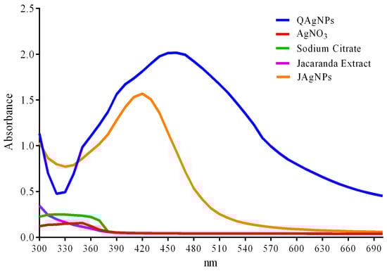UV–Vis spectrophotometry was used to confirm the presence of silver nanoparticles in the samples. The spectrophotometric analysis conducted 24 h after the synthesis revealed an absorbance peak at 420 nm for the JAgNPs and at 450 nm for the QAgNPs (Figure 4), which are consistent with previously reported values in the synthesis of silver nanoparticles [26,29]. In contrast, the sodium citrate, silver nitrate, and Jacaranda flower extract did not show absorbance peaks in the range of silver nanoparticles. The absorbances considered the dilution factor.