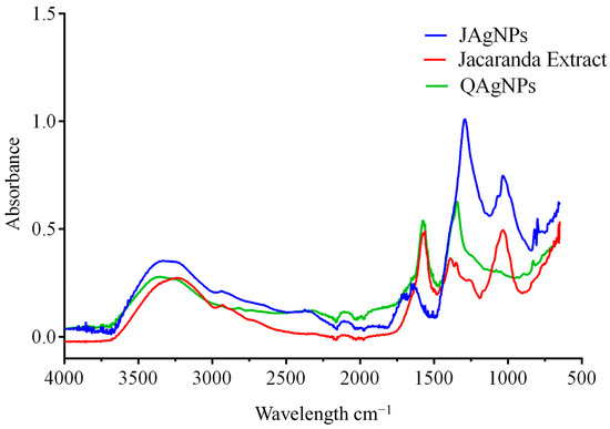 FTIR spectra of Jacaranda extract, JAgNPs, and QAgNPs.