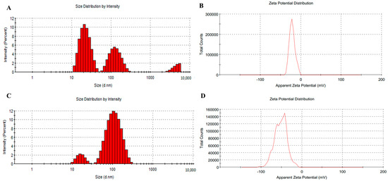 The size distribution observed, with the letters A and C for JAgNPs and QAgNPs, respectively. The Z potential is represented with the letters B and D for JAgNPs and QAgNPs, respectively. (A) The size distribution in percentage of intensity of the JAgNPs. Each peak represents a size in nanometers, highlighting the presence of AgNPs of various sizes, with many of the peaks at 22.64 nm, with an average size of 33.02 nm. (B) Z potential of JAgNPs, with a peak of −21.1 mV. (C) The size distribution in relation to the percentage of intensity of the QAgNPs in which only 2 peaks are observed: 1 at 16.56 nm and a second with greater intensity at 115.6 nm, with an average size of 74.76 nm. (D) QAgNPs with 3 peaks of −43.2, −66.3, and −102 mV and areas of 62.4, 37.1, and 0.4%, respectively, with an average Z value of −51.7 mV.