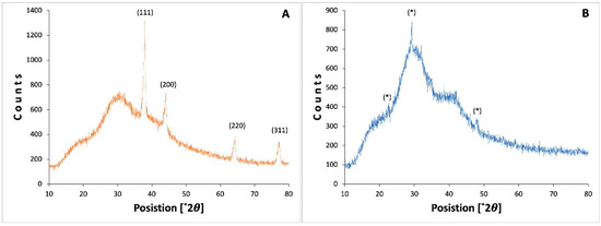 X-ray diffraction is a technique to mainly determine the crystal structure. However, it is also used to determine the atomic arrangement, the lattice parameters, and the size; according to the calculation, the size of the QAgNPs crystal was 16.8 nm. Figure 7A shows the peak distribution pattern for the QAgNPs, which present the characteristic peaks of the silver NPs, which, according to the diffraction patterns at 38.2°, 46.3°, 34.74°, 77.23°, and 81.82° correspond to the planes (111), (200), (220), (311), and (222), respectively [43]. On the other hand, Figure 7B shows the distribution pattern corresponding to structures with patterns similar to Ag2O3, AgO described for amorphous structures [44]; under this analysis, the QAgNPs can be considered structures with good organization and crystallinity compared to the structures of JAgNPs, which can be seen by TEM micrographs.