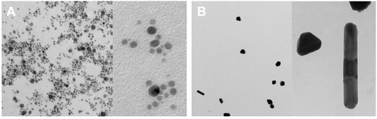 Images obtained by TEM: (A) JAgNPs; (B) QAgNPs.