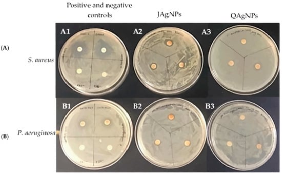 Disc diffusion results of controls (A1,B1), JAgNPs (A2,B2), and QAgNPs (A3,B3) against S. aureus (A) and P. aeruginosa (B).