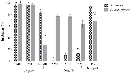 Antibiofilm activity by crystal violet method of JAgNPs and QAgNPs. The positive control was used as a multi-enzymatic detergent capable of eliminating biofilm. The concentrations for AgNPs were ½ MIC, MIC, and 2 MIC, with values for JAgNPs of 2.67, 5.35, and 10.7 μg/mL, respectively, and for QAgNPs, 58.75, 117.5, and 235 μg/mL respectively. Capital letters correspond to S. aureus, and lowercase letters correspond to P. aeruginosa. Different letters represent significant differences. Comparisons between the MICs by group (JAgNPs and QAgNPs): we can only find one significant difference between ½ MIC of JAgNPs in P. aeruginosa versus 2 MIC and MIC.