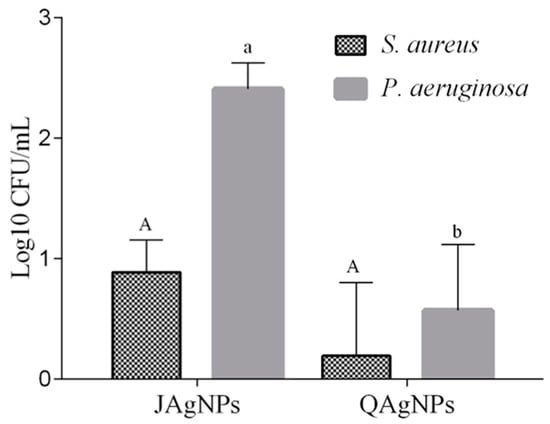 The results for the in vivo antibiofilm activity of AgNPs are presented in Figure 12. JAgNPs had higher logarithmic (Log) reduction values than QAgNPs for S. aureus and P. aeruginosa bacterial species when the MIC of both AgNPs in both strains was analyzed (MIC: 5.3 and 117.5 µg/mL). The biosynthesized JAgNPs showed a log reduction of 0.63 and 2.38 for S. aureus and P. aeruginosa, respectively, while the chemically synthesized QAgNPs presented a log reduction of 0.006 and 0.41 for the same bacterial species.
