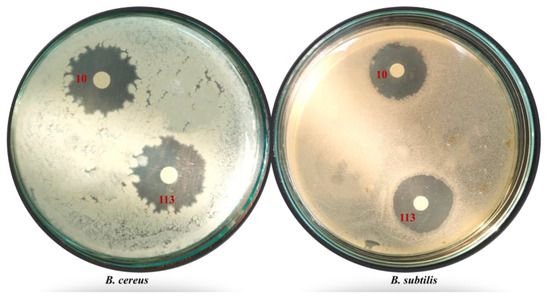 Inhibition zones generated by bacterial isolates No. 10 and 113 against S. typhi and B. sereus pathogenic test microorganisms (four replicates each treatment).