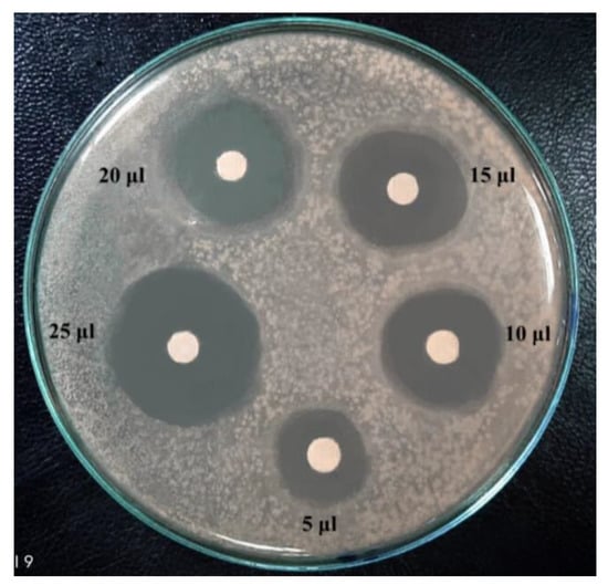 On nutrient agar plates, the isolated colonies of the mutant bacteria were tested against the pathogen microorganisms used before. Each 24 h old (50 µL) pathogenic microorganism was spread and plated after suspension. The discs impregnated with bacterial culture supernatant of the mutants of both bacteria grown for 48 h and centrifuged at 6000 rmp, at 4 °C, for 15 min were placed on the surface of the nutrient agar medium. Each test plate was comprised of four discs. Two mutagen culture supernatant-treated discs were placed at about equal distances from each other on the same plate. Standard antibiotic discs included vancomycin for B. cereus and S. aureus. Tetracycline was used for B. subtilis, M. luteues, and P. ariginosa. Amoxicillin was used for E. coli. Ciprofloxacin was used for S. typhi, while penicillin was used for Klebs. sp. The negative control was 100% DMSO. After that, the plate was incubated for 24 h at 37 °C. The plates were measured for an inhibitory zone diameter after the incubation. For each test, three replicas were employed [66].