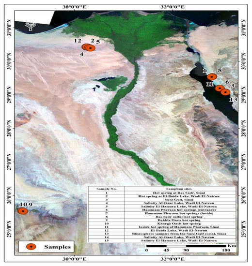 Figure 4 shows water samples from hot springs and soils close by that were collected from several locations in Egypt including Hammam Pharaon, the Closed Sulfur Lake at Ras Sedr at Sinai, and the Closed Dakhla as well as Kharga lakes. Samples affected by high salinity were obtained from different lakes, such as Red Lake, Gaar Lake, and Al-Beuda Lake at Wadi-Natrun, Egypt. Samples of hot springs were collected in double-walled containers to maintain the temperature until analysis. Samples of salt lakes were obtained in sterile plastic containers and kept in an ice box and then in a refrigerator at 4 °C until analysis. Using a random sampling technique, soil samples were taken from the study area at a depth of 5–10 cm and kept in sterile polyethylene bags at 4 °C until analysis. All samples were examined according to APHA (American Public Health Association) guidelines [53].