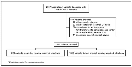 Although immunomodulatory treatments for COVID-19, such as dexamethasone and tocilizumab, have been associated with lower mortality [,], they could also lead to an increased risk of secondary infections. The use of methylprednisolone, hepatic failure, and diabetes have been associated with increased susceptibility to secondary infections []. Secondary bacterial infections lead to decreased survival rates and are a leading cause of death among severe COVID-19 patients []. Infections due to MDR pathogens have been associated with a mortality of 60% []. Recognition of risk factors for HAI in patients with COVID-19 is warranted. In this cohort study, we aimed to describe the risk factors associated with the development of HAI in hospitalized patients with severe and critical COVID-19.