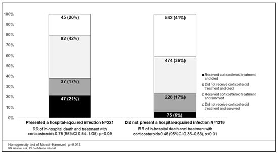 Association of in-hospital death and treatment with corticosteroids according to presence or absence of hospital-acquired infections.
