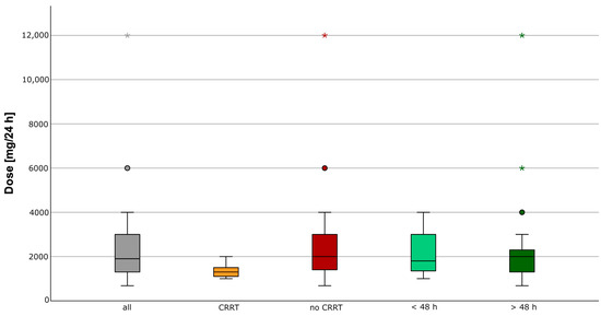 Figure 1. Observed meropenem doses. Distribution of the observed meropenem doses given in mg of all meropenem concentration measurements (n = 229), with CRRT (n = 21), without RRT (n = 208), in the first 48 h (n = 91), and after 48 h (n = 138). * extreme value, o outlier.