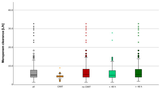 Figure 2. Observed meropenem clearance. Distribution of the observed meropenem clearance given in L/h of all meropenem concentration measurements (n = 229), with CRRT (n = 21), without RRT (n = 208), in the first 48 h (n = 91), and after 48 h (n = 138). * extreme value, o outlier.