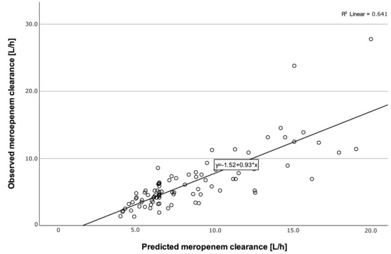 A total of 229 meropenem concentrations (cMER) were measured from the 91 included patients. The median (IQR) cMER was 14.1 (6.0) mg/L (cMER after software-guided empiric daily dosing: 15.6 (7.5) mg/L, cMER after TDM-guided daily dosing: 13.1 (5.5) mg/L). The median observed meropenem clearance (CLMER) was 5.2 (3.8) L/h (Figure 2). No ARC was observed (Figure 2) during the first 48 h of treatment. The median meropenem clearance predicted by CADDy (CLCADDy) was higher than the observed clearance (CLMER48) in the first 48 h (CLCADDy 7.1 (4.2) L/h vs. CLMER48 5.1 (3.8) L/h). The predictive performance of CADDy was assessed by comparing the predicted clearance with the observed clearance (Figure 3).