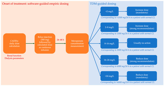 Figure 5. Therapeutic drug monitoring (TDM) program. Individualized dosing procedures including renal-dose-adjusted empiric dosing using CADDy (calculator to approximate drug dose during dialysis) and subsequent concentration measurements. Therapeutic drug exposure was defined as cMER of 8–16 mg/L.