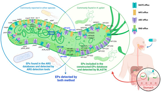- Raj, D.S.; Kumar Kesavan, D.; Muthusamy, N.; Umamaheswari, S. Efflux pumps potential drug targets to circumvent drug Resistance—Multi drug efflux pumps of Helicobacter pylori. Mater. Today Proc. 2021, 45, 2976–2981. [Google Scholar] [CrossRef]