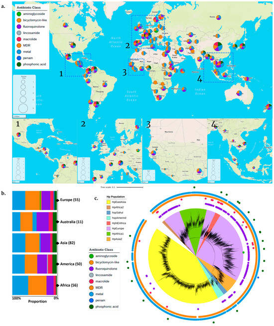 Several challenges need to be addressed, beginning with the preferred tools to better detect ARG in the H. pylori genome, the global H. pylori ARG distribution, and the impact of the presence of ARG on the clinical AMR phenotype. Hence, we attempted to address these challenges using a global H. pylori genome collection covering 68 countries from 5 different continents. We focused on ARG against drugs or other potential antimicrobial substances. In this study, we defined ARG as any potential acquired antimicrobial resistance-related gene listed in public ARG databases that include AMR-associated genes tested in many bacterial species (including members of the family Helicobacteraceae), but excluding most of well-known genes covering AMR through mutations, such as the mutations in pbp1A (ß-lactam-resistant), gyrA (fluoroquinolones-resistant), 23S rRNA (macrolides-resistant), 16S rRNA (tetracycline-resistant), and rpoB (ryfamycins-resistant), which mainly belong to the antibiotic target alteration gene, also known as drug target-mediated resistance or modification of the drug target [5]. Based on these criteria, we highlighted the global epidemiology of ARG in H. pylori and found that most are yet to be experimentally proven. In addition, we also analyzed the potential efflux pumps (EPs)-related AMR. These results will lead to many opportunities for future H. pylori ARG studies. Finally, we also attempted to identify new ARG candidates in H. pylori using antibiogram data retrieved from multinational clinical patient isolate strains.