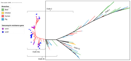 SNP-based phylogeny of 429 Enterococcus faecium isolates obtained from beef cattle (green branches, n = 59), meat chickens (orange branches, n = 8), pigs (blue branches, n = 60), and humans (red branches, n = 302). Purple stars indicate the isolates shown to contain vanA and blue stars indicate the isolates shown to contain vanB (both genes imparting resistance to vancomycin). None of the beef cattle, meat chicken, and pig isolates (encompassed within the square box) possessed vanA or vanB vancomycin resistance genes.