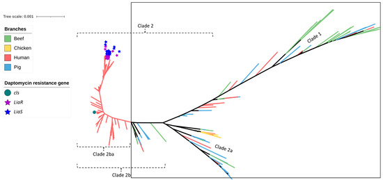 SNP-based phylogeny of 429 Enterococcus faecium isolates obtained from beef cattle (green branches, n = 59), meat chickens (orange branches, n = 8), pigs (blue branches, n = 60), and humans (red branches, n = 302). The green circle indicates the isolate shown to contain cls, the purple stars indicate the isolates shown to contain liaR, and the blue stars indicate the isolates shown to contain liaS mutations imparting resistance to daptomycin. None of the beef cattle, meat chicken, and pig isolates (encompassed within the square box) possessed these gene mutations.