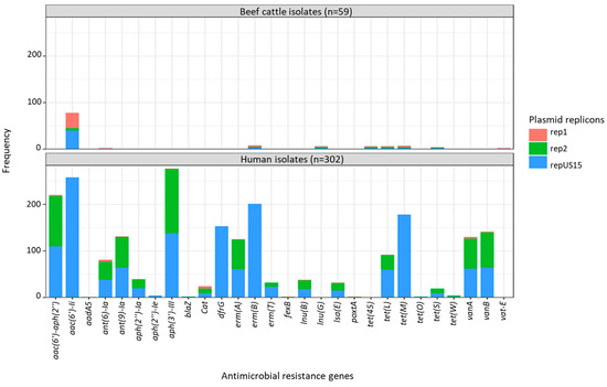 The presence of vanA (found only in isolates from humans) was mostly linked to three plasmid replicons: rep2 (98.5%; 64/65), repUS15 (95.4%; 62/65), and rep11a (81.5%; 53/65). Most E. faecium isolates carrying the streptogramin resistance gene vatE (found only in isolates from animals) were associated with the plasmid replicons rep2 (80%; 4/5) and rep17 (60%; 3/5) (Figure 7). When plasmid replicons and E. faecium ARGs known to be plasmid-mediated were cross tabulated and compared according to isolate source (beef cattle vs. human), clear differences in matches were apparent between the two host sources, apart from repUS15, which was highly prevalent in both groups of isolates and often associated with aac(6’)-Ii, erm(B), and tet(M) ARGs (Figure 8).