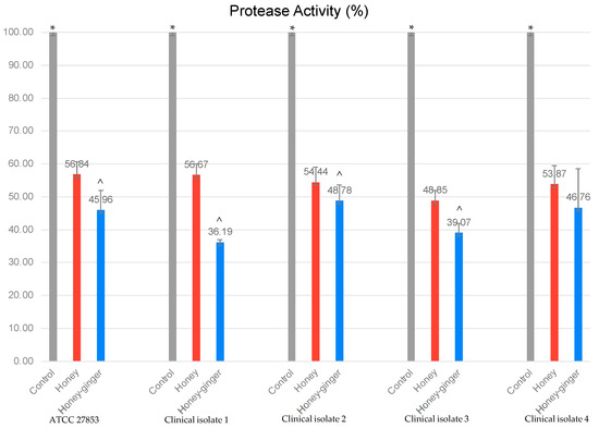 Protease activity of different P. aeruginosa isolates was evaluated using azocasein assay. The reduction of protease activity was measured by OD at 400 nm. Control: untreated bacteria; Honey–ginger: ginger-enriched honey. Protease activity is expressed in percentage (%). Data denote mean values of triplicates. * Significance at p < 0.05 between control with treatment groups (honey and ginger-enriched honey); ^ significance at p < 0.05 between ginger-enriched honey and honey.