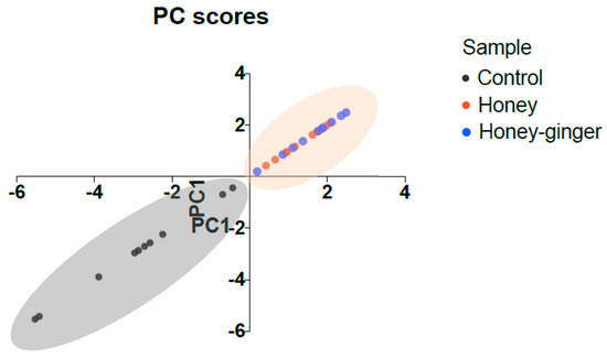 Plot of principal component scores between untreated bacteria (control) and treated bacteria (honey and ginger-enriched honey). The formation of two clusters (grey represents control group; red represents treatment groups) revealed the differences of data obtained from different assays between the control and treatment groups. However, no clear differences were seen between honey and ginger-enriched honey groups. Control: untreated bacteria; Honey–ginger: ginger-enriched honey.