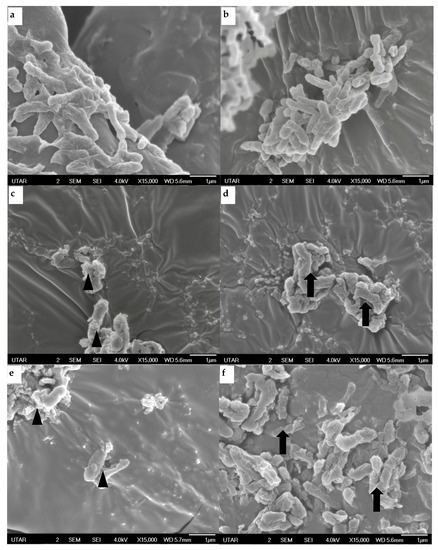 SEM images of P. aeruginosa isolates: (a) bacteria (clinical isolate 1) without treatment (control); (b) bacteria (clinical isolate 3) without treatment (control); (c) bacteria (clinical isolate 2) treated with honey; (d) bacteria (clinical isolate 4) treated with honey; (e) bacteria (clinical isolate 2) treated with ginger-enriched honey; (f) bacteria (clinical isolate 3) treated with ginger-enriched honey. The arrowheads and arrows in the images show the significant distortion and rough surface of the bacteria, respectively.