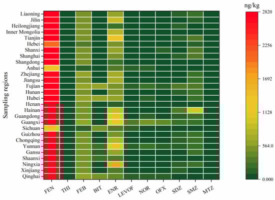 Average concentrations of the antibiotics and anthelmintics (detection frequencies higher than 50%) in the whole cow milk samples from different regions of China.