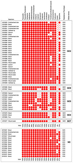 Clinical specimens and antimicrobial susceptibility profiles of all isolates. Reduced susceptibility (intermediate or resistance) is denoted by red icons, while the white ones correspond to full susceptibility. The isolates were segregated according to their global clones. MDR, multidrug-resistant; XDR, extensively drug-resistant; PDR, pan-drug resistant; GC, global clone; ND, the global clones could not be determined due to poor quality of draft genomes that were excluded from all subsequent genomic analyses; %R/I, percentage of reduced susceptibility to each antimicrobial agent. The figure was created using the MORPHEUS online tool (https://software.broadinstitute.org/morpheus, accessed on 3 January 2023) and edited using Inkscape version 1.2 (https://inkscape.org, accessed on 10 September 2022).