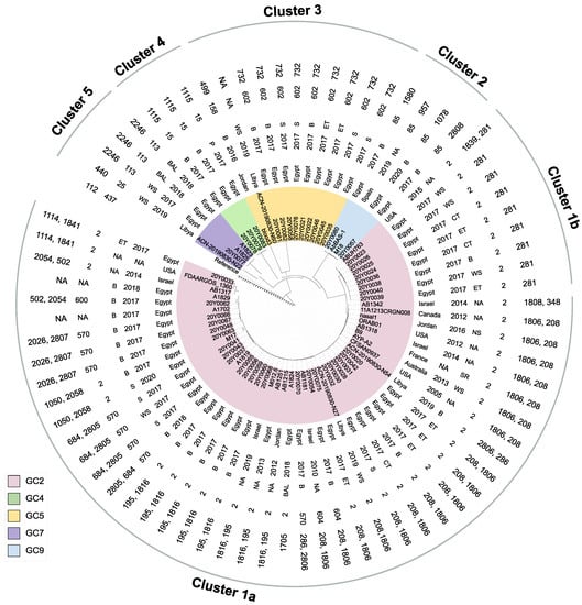 The cgSNP-based analysis encompassing the Egyptian isolates and global strains identified 64,994 SNPs. Five clusters that fully matched the GCs of the isolates were differentiated (Figure 2). GC2 isolates comprised the largest cluster (cluster 1), which was divided into two subclusters (1a and 1b). The larger one (cluster 1a) comprised all GC2 isolates except those belonging to ST281Oxf. Members of cluster 1a showed the highest genomic diversity of all tested isolates. Up to 4012 SNP differences were found among cluster 1a isolates, with some showing higher similarity to foreign strains. Isolates 20Y0037, 20Y0041, and 20Y0043 differed by only four SNPs from strain A1819 isolated in Egypt in 2020. As few as 13, 16, 20, 29, and 31 SNPs separated several isolates of cluster 1a from foreign strains collected in the USA, Libya, France, Jordan, and Israel. Six ST208/1806Oxf strains differed by only 13 SNPs from the US-American strain CFSAN, which dated back to 2005. Cluster 1b included ST281Oxf isolates. These showed high similarity with an SNP range of 0 to 4. In contrast, the distance to strain ABUH763, which was collected in the USA in 2015, was very high (minimum SNPs = 647). Within cluster 2 harbouring GC9 isolates, isolate 20Y0057 showed a closer SNP distance (n = 265) to strain AbBAS-1 from Spain than strain M18 (352 SNPs) from Egypt isolated in 2020. Moreover, isolate 20Y0057 differed from isolate 20Y0080 collected in the current study by 692 SNPs. Only five SNPs were found in strain ACN-20190830-N60 isolated in Libya in 2019 compared with GC5 isolates collected in the current study. These, in turn, showed SNP differences ranging from 0 to 7. GC4 and GC5 contained the fourth and fifth cluster, respectively. Even though isolate 20Y0077 showed a relatively close SNP distance (SNPs = 19–25) to other Egyptian strains, it exhibited 12,290 SNPs compared with a strain from Libya collected in 2019.