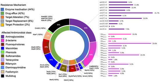 Graphical representation of the in silico identified potential resistance determinants of the total collection of A. baumannii isolates. The figure shows the contribution of different resistance mechanisms to the resistome and the antimicrobial classes affected by each. For each antimicrobial class, the contribution of individual resistance determinants is also shown. The figure was created using Microsoft Office Excel 2016 and edited using Inkscape version 1.2 (https://inkscape.org, accessed on 10 September 2022).
