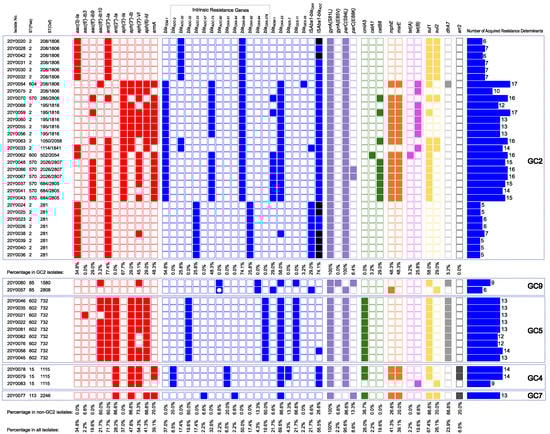 As shown in Figure 4, the average number of acquired resistance determinants was highest (14.6) among a subset of GC2 isolates possessing both blaOXA-23 and blaTEM-1. Moreover, fewer determinants were carried by isolates of GC7 (13), GC5 (12.8), GC4 (12.3), and GC9 (7.5) than those belonging to GC2 that did not possess blaOXA-23 and blaTEM-1 (6).