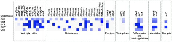 Heatmap showing the distribution of different resistance determinants in different GCs of Egyptian A. baumannii isolates. The intensity of the blue colour is directly proportional to the prevalence of each resistance gene in the isolates that belong to each GC. * Results shown for GC7 are based on one isolate only. The figure was created using the MORPHEUS online tool (https://software.broadinstitute.org/morpheus, accessed on 3 January 2023) and edited using Inkscape version 1.2 (https://inkscape.org, accessed on 10 September 2022).