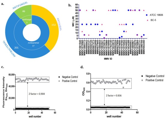 (a) MMV pandemic box screening identified 30 compounds (3 antifungal and 27 antibacterial) with antimicrobial activity against A. baumannii. The outer circle represents the total compounds classified as antibacterial, antifungal, and antiviral according to MMV. The inner circle represents antimicrobial compound hits, with MIC ≤ 50 µM. (b) MICs of 30 identified antimicrobial compounds against A. baumannii isolates ATCC 19606 and BC-5. (c) Validation of resazurin-based screening assay demonstrating a Z-factor of 0.904 in comparison with (d) absorbance-based assay with a Z-factor of 0.836, for high throughput screening against A. baumannii.