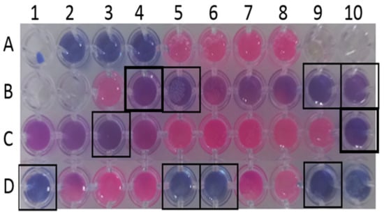Metabolic activity of bacterial cells analyzed by resazurin post-biofilm-treatment with compounds from the Pandemic Response Box: negative control (A2–A4); 19606 control (A5–A8); 19606 treated (B3–C4) MMV1580173 (B3), MMV396785 (B4), MMV1578568 (B5), MMV1578554 (B6), MMV1634402 (B7), MMV1579780 (B8), MMV1579850 (B9), MMV1578564 (B10), MMV1593541 (C1), MMV1580854 (C2), MMV1578574 (C3), MMV1578566 (C4), BC-5 control (C5–C8), BC-5 treated (C9–D10) MMV1580173 (C9), MMV396785 (C10), MMV1578568 (D1), MMV1578554 (D2), MMV1634402 (D3), MMV1579780 (D4), MMV1579850 (D5), MMV1578564 (D6), MMV1593541 (D7), MMV1580854 (D8), MMV1578574 (D9), and MMV1578566 (D10).