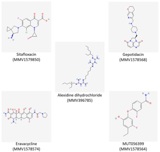 A total of 12 of these 30 pandemic box compounds with MIC ≤ 25 µM against both ATCC 19606 and BC-5 A. baumannii isolates were analyzed for their ability to eliminate A. baumannii growth in the biofilm state. Five of the above twelve compounds, alexidine dihydrochloride (MMV396785), gepotidacin (MMV1578568), eravacycline (MMV1578574), MUT056399 (MMV1578564), and sitafloxacin (MMV1579850) at 50 µM were able to reduce metabolically active cells and could eradicate pre-formed biofilms (Figure 2, Supplementary Figure S1). The chemical structures and trivial names of the compounds identified as antibiofilm inhibitors against A. baumannii are shown in Figure 3.