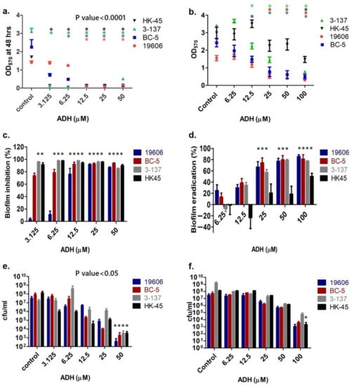 The ability of ADH to eradicate pre-formed A. baumannii biofilms was also analyzed using a crystal violet assay (Figure 5b). On treating 48 h old biofilms with ADH at 6.25 μM (2 × MIC) and 12.5 μM (4 × MIC) concentrations, a slight increase in biofilm formation was observed in the case of ATCC 19606, 3-137, and HK-45, respectively (Figure 5b,d). However, ADH at 25 μM (8 × MIC) concentration significantly reduced the biomass of biofilms formed by ATCC 19606, BC-5, and 3-137 by more than 60%. At a higher concentration of 100 μM, the biomass of the biofilms formed by all four isolates was significantly reduced (Figure 5d). Most antibiotics are known to promote biofilm formation and are required at 1000 times MIC to eradicate pre-formed biofilms [29]. On further calculating the number of viable biofilm-associated cells, it was found that ADH could significantly reduce the cfu by ≥4 log10 fold at a concentration of 100 μM (Figure 5f).
