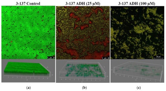 Biofilms were allowed to form on the glass coverslip by bacterial cells for 48 h, and were exposed to TSB containing 0 μM, 25 μM, and 100 μM ADH for 24 h. Then, coverslips were washed three times with filtered Milli-Q water, and biofilms were stained with a LIVE/DEAD BacLight Bacterial viability kit (L13152, Invitrogen, Waltham, MA, USA) containing fluorescent probes Syto 9 and propidium iodide (PI) at a concentration of 3 µL/mL, as mentioned previously [25]. Further, the biofilms were allowed to stain for 30 min in the dark, and then excess dye was removed by washing with filtered Milli-Q water. Images were acquired using inverted confocal laser scanning microscopy (UC7, Leica Microsystems, Wetzlar, Germany). The images were obtained at a magnification of 400×. Z-stacks were attained along the thickness with the scale of 1 µm.