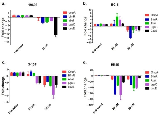 qRT-PCR was performed to analyze the expression of five biofilm-associated genes (ompA, bfmR, abaI, csuE, and pgaC) when exposed to ADH. The untreated culture was used as the control, and changes in the expression of biofilm-associated genes in biofilm-embedded cells exposed to 25 µM (8 × MIC of ADH) and 50 µM (16 × MIC of ADH) ADH concentrations were analyzed. All biofilm-associated genes tested were found to be downregulated at the 50 μM (16 × MIC) concentration in all the A. baumannii isolates (Figure 7). In the case of ATCC 19606 and HK-45, downregulation of biofilm-associated genes was observed on exposure to 25 μM concentrations of ADH (Figure 7a,d).