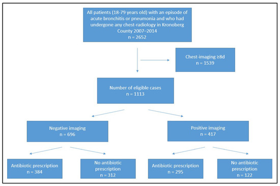 We did not include patients over 79 years of age due to the lack of EMR-connected prescription history [16]. Contacts occurring within 6 weeks for the same patient and diagnosis were defined as one episode or case. Twenty-three patients had more than one case of LRTI during the study period (2007–2014), and no one had more than two cases. The chest imaging results were divided into two groups: negative/normal examination (no signs of pneumonia) vs. positive examination (pneumonia signs visible).