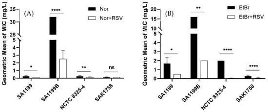 Minimum inhibitory concentration of (A) norfloxacin and (B) ethidium bromide in the presence and absence of resveratrol (0.25× MIC) against S. aureus with different levels of NorA expression. The values are expressed as the geometric mean and geometric standard deviation of at least three independent experiments. * p < 0.05; ** p < 0.01; **** p < 0.0001; ns: no significance.
