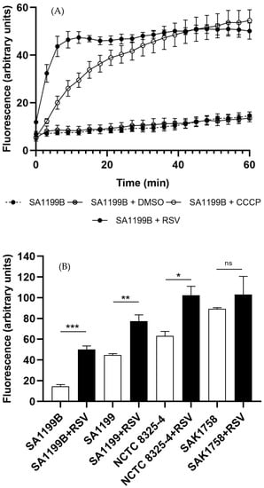 Effect of resveratrol (RSV) on intracellular accumulation of ethidium bromide (A) in S. aureus SA1199B (norA++) in the presence and absence of resveratrol (0.25× MIC). The control with CCCP (1.25 mg/L), a known EPI, and the DMSO (0.25%) solvent control are also represented. (B) Comparative ethidium bromide accumulation in S. aureus with different levels of NorA expression, SA1199B (norA++), SA1199 (wildtype), NCTC 8325-4 (wildtype) and SAK1758 (∆norA), after 60 min of accumulation in presence and absence of resveratrol (0.25× MIC). * p < 0.05; ** p < 0.01; *** p < 0.001; ns: no significance.