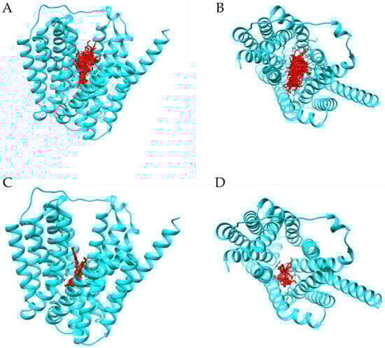 Different orientations of reserpine (red, (A,B)) and resveratrol (red, (C,D)) obtained in the docking with Staphylococcus aureus NorA efflux pump (blue). Using a grid covering the entire protein, it is possible to observe that all conformations are presented in the same location, suggesting a credible binding site of reserpine in the NorA pump.