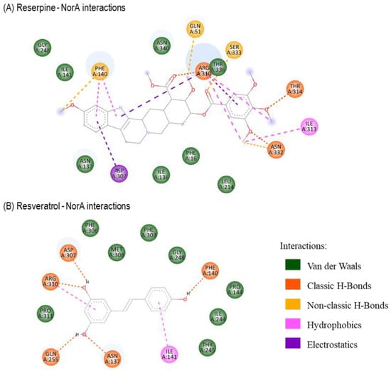 Two-dimensional perspective of the interactions between reserpine (A) and resveratrol (B) with NorA efflux pump. Each color represents the type of interaction.