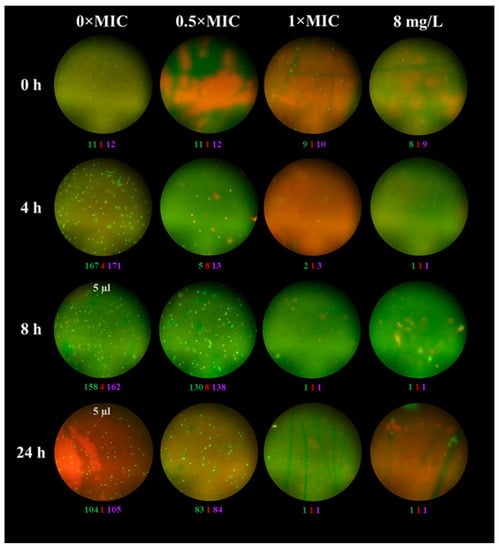 Typical microscope fields of K. pneumoniae 1676 exposed to 0×, 0.5×, 1 × MIC, and 8 mg/L (clinical breakpoint) of meropenem at 0, 4, 8, and 24 h. The green, red, and purple numbers show the average numbers of cells in the fields that have green, red, and total fluorescence, respectively.