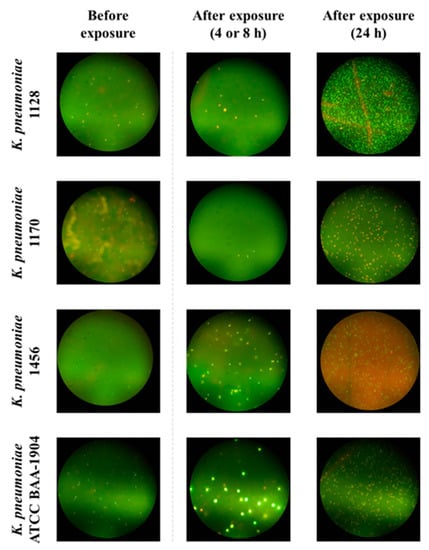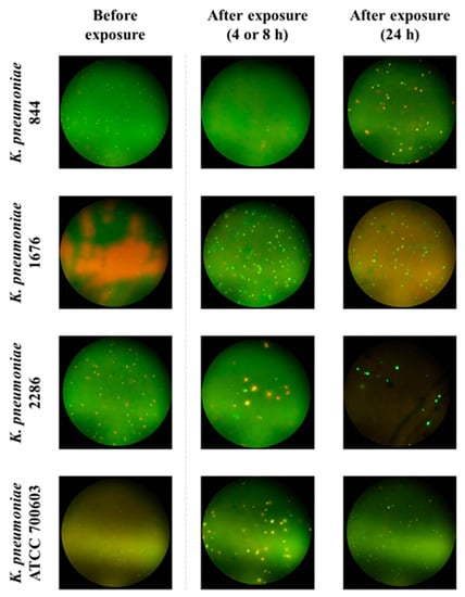 The changes in the numbers and characteristics of bacteria observed by microscopy in the absence and presence of meropenem can be seen in the example of K. pneumoniae 1676 (Figure 1). In the absence of the antibiotic, the number of cells steadily increased; they had a typical shape and a uniform, predominantly green fluorescence. Cells exposed to 0.5 × MIC of meropenem remained viable after 4 h, and the proportion of cells with red fluorescence became bigger than the proportion of cells with green fluorescence. Subsequent regrowth led to a significant increase in the bacterial numbers and the proportion of cells with green fluorescence. In addition to typical variants, cells of a more rounded shape and with brighter fluorescence were present in the fields. At the higher antibiotic concentrations, starting from 4 h single cells could come across in the field of view or their complete absence was observed.