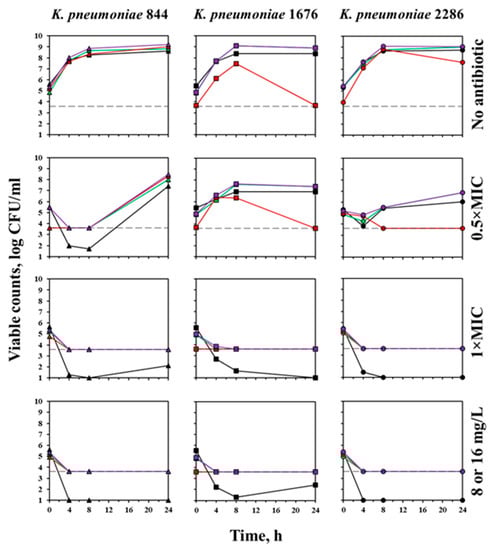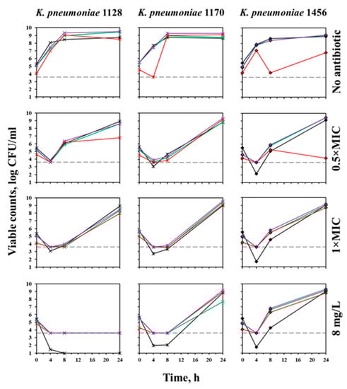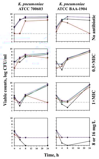 In the absence of meropenem, bacterial counts exceeded 8 log (CFU/mL) by 8 h, while at the sub-MIC concertation of meropenem, moderate growth (up to 6.9–7.6 log (CFU/mL) depending on the evaluation method) and regrowth (up to 5.5 log (CFU/mL)) was noted with K. pneumoniae 1676 and K. pneumoniae 2286, respectively. With K. pneumoniae 844 exposed to 0.5 × MIC of meropenem, no regrowth was noted by 8 h, but at 24 h its bacterial density was similar to the one not exposed to the antibiotic. At meropenem concentration of 1 × MIC or higher, viable counts of all three strains decreased below the limit of detection and remained at this level until the end of the observation.