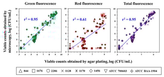 Correlation between viable counts of K. pneumoniae obtained via microscopy and agar plating at the same time points. Combined data on all eight K. pneumoniae strains fitted by Equation (1): a = 0.319, b = 0.961 (green fluorescence); a = 1.119, b = 0.696 (red fluorescence); a = 0.303, b = 0.985 (total fluorescence).