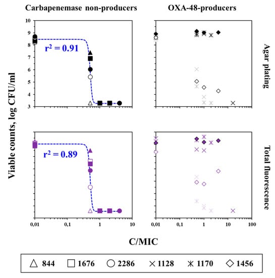 The possibility of early meropenem MIC determination (within 8 h) was evaluated by the regression analysis of time-kill data, obtained with the clinically relevant OXA-48 producing and carbapenemase non-producing strains. If the method proposed in this study works as expected, bacterial counts at 8 and 24 h should be equally high in the absence of the antibiotic and equally low at the antibiotic concentration of 1 × MIC and above. In the presence of the antibiotic at concentrations below the MIC, a moderate number of bacteria at 8 h and a high number of bacteria at 24 h should be expected. Such results would likely be described by the sigmoid function. This assumption turned out to be partially true for the data obtained in the present study. Regrowth in carbapenemase non-producing K. pneumoniae 844, K. pneumoniae 1676, and K. pneumoniae 2286 was observed only at antibiotic concentrations below 1 × MIC, and usually already appeared at 8 h. Thus, the combined data for 8 and 24 h at various C/MICs could be fitted with the sigmoid function (Equation (2)) with r2 = 0.91 and 0.89 for agar plating and total fluorescence, respectively (Figure 8). Corresponding data for OXA-48 producers could not be fitted with this function: Points were scattered horizontally due to a change in the meropenem activity in an increased volume of the medium and vertically due to a significant gap between the viable counts at 8 and 24 h.