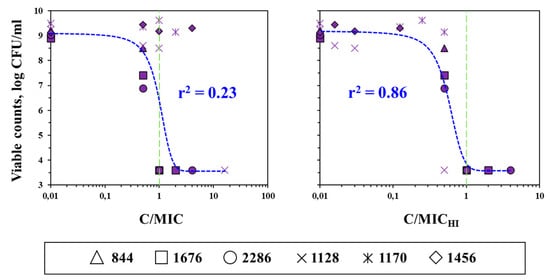 Correlation between viable counts of K. pneumoniae (combined data on three carbapenemase non-producing and three OXA-48-producing isolates, estimated by total fluorescence) obtained at 24 h and C/MIC or C/MICHI. Data were fitted by Equation (2): Y0 = 3.6, x0 = 0.997, a = 5.72, b = −0.3 (left panel); Y0 = 3.6, x0 = 0.571, a = 5.733, b = −0.15 (right panel).