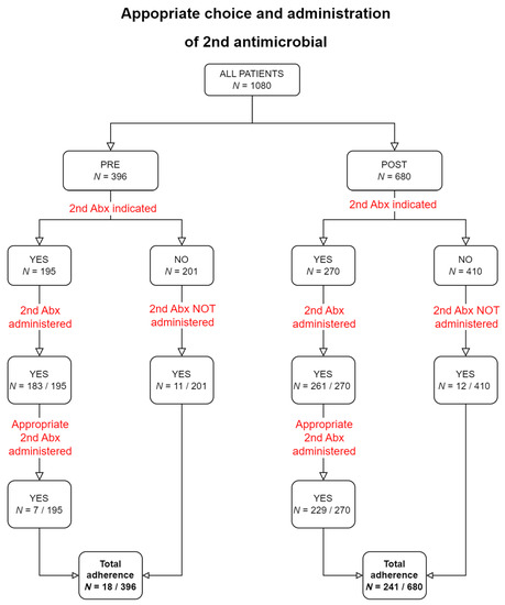 The rate of appropriate choice of the first antimicrobial was high in the PRE phase, yet it increased significantly after the intervention (Table 3). Adherence to the choice of the second antimicrobial (Figure 2) was very low before the intervention and increased significantly after the intervention, but it was still low [PRE 4.5% (18/400) vs. POST 35.4% (241/680), chi-square p < 0.001]. It is noted that non-adherence both in the PRE and POST phase, mostly involved administration of combination PAP when it was not indicated (see Figure 2 for details). Adherence to the appropriate timing of the administration was very high for both antimicrobials before the intervention and it remained so and afterwards (Table 3). Intraoperative redosing was rarely needed for the first antimicrobial, which was vancomycin with its long half-life (0.9%, 10/1077), but it was indicated for the second antimicrobial in a significant proportion of operations (777/1034, 75.1%). Despite this, no intraoperative redosing was documented for any operation, i.e., adherence to redosing was 0% both before and after the intervention.