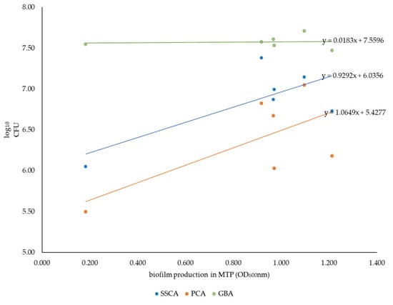 In the current study, we also looked at the correlation between biofilm production in the MTP assay and the three assays used in the disinfectant testing. In the MTP assay, biofilm production was measured using CV, which stains the biofilm matrix in addition to live and dead cells []. However, in the other assays, we assessed the surviving cells by counting the CFUs. Therefore, the biomass formed may vary, even though the number of surviving CFUs is similar. Nonetheless, positive correlations were observed between the MTP assay results and CFU counts in the SSCA and PCA. This correlation was not seen in the GBA. This may be due to the similar conditions in the MTP assay to SSCA and PCA (static incubation, biofilm in the liquid–air interface). In addition, more biofilm was formed in the GBA than in the other assays, and even the L01764-06 strain possessing a low-biofilm-forming capacity in the MTP assay developed substantial biofilms (with respect to cell numbers) in the GBA approach.